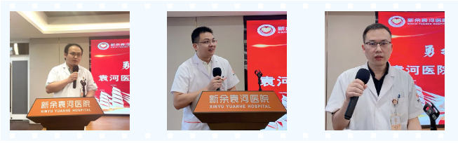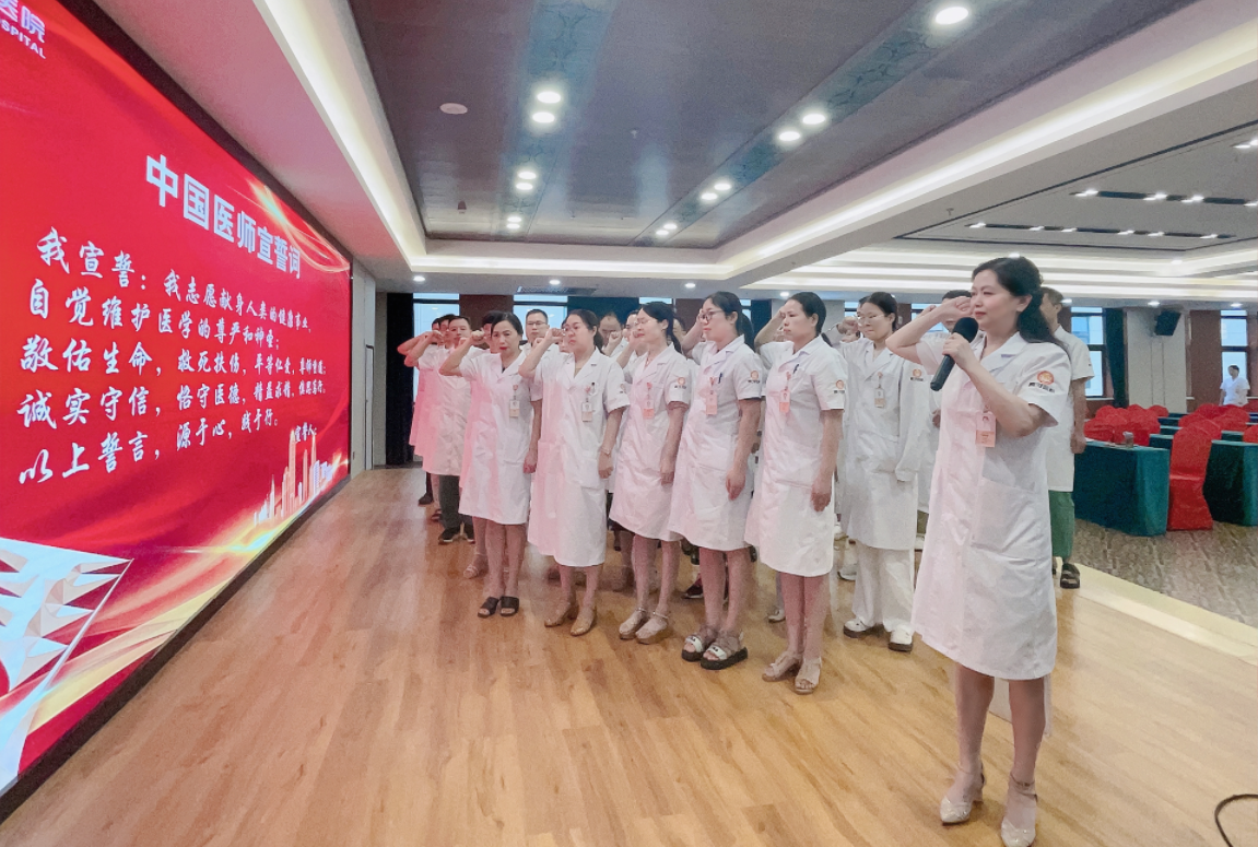 副院长彭国兰带领全体医师进行了宣誓,重温中国医师誓言,牢记守护人民群众健康的使命担当。优秀医师代表熊小勇、刘艳平、朱双抢先后发言。